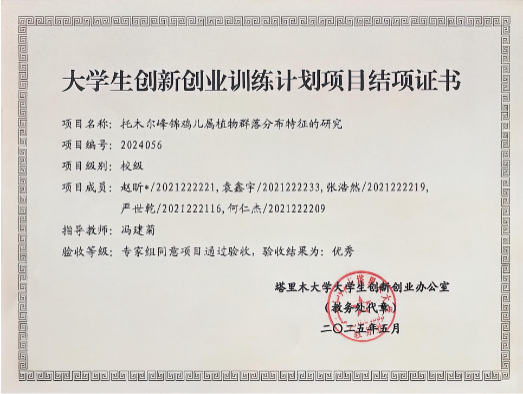 科研竞赛:主持大创项目《托木尔峰锦鸡儿属植物群落分布特征的研究》,在项目中主要负责项目的整体方案制定,并对方案的各个环节进行详细规划,组织组员对托木尔峰锦鸡儿属植物群落分布进行野外调查,并定期对项目情况进行总结,推进项目的完成。