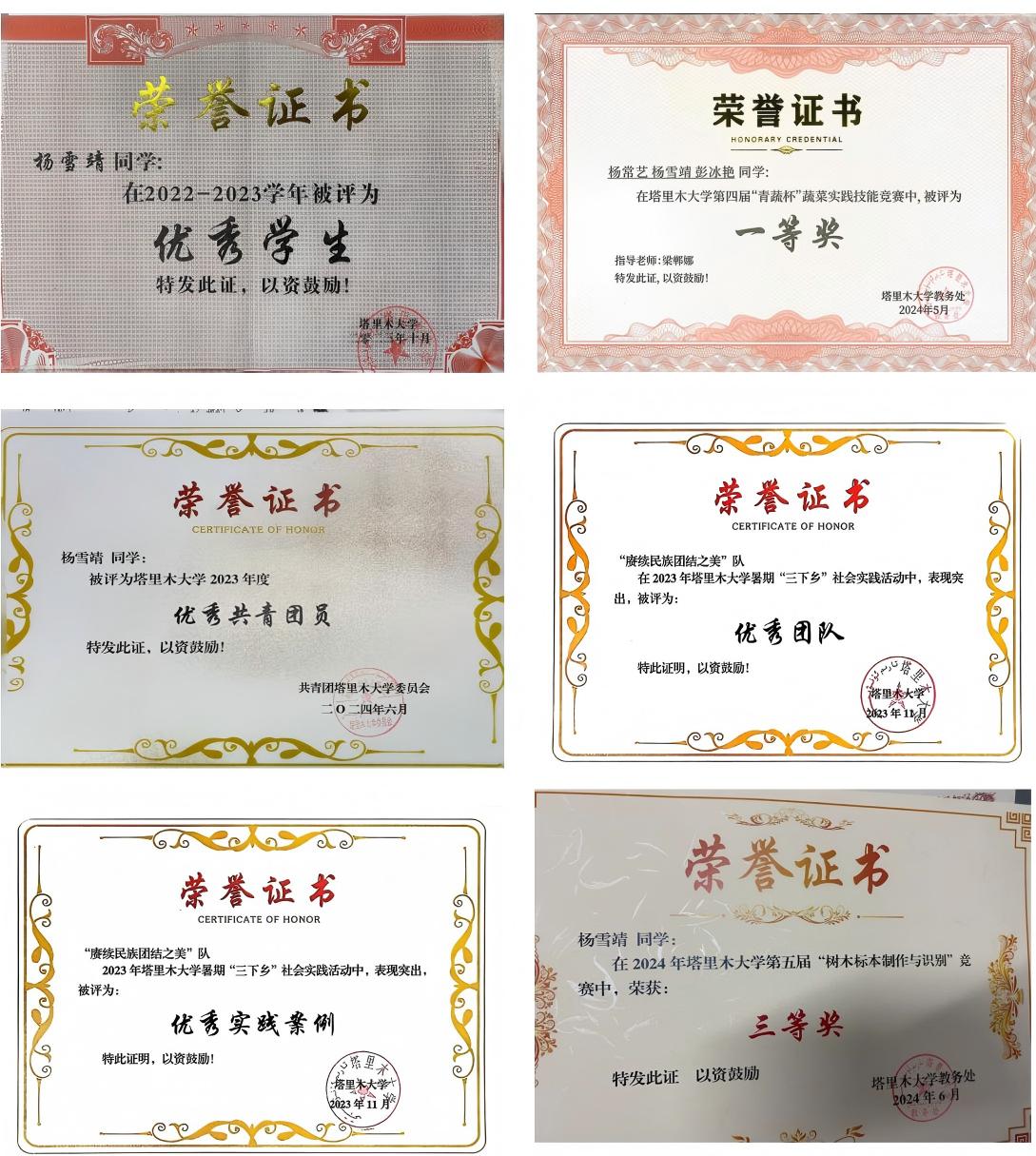 曾获三次国家励志奖学金,多次校级综合奖学金,校级优秀员工、优秀共青团干部、优秀共青团员、三下乡优秀团队和优秀实践案例以及先进个人、校级青蔬杯竞赛一等奖、“树木标本制作与识别”竞赛三等奖、“外教社杯”全国高校员工跨文化能力大赛三等奖等。