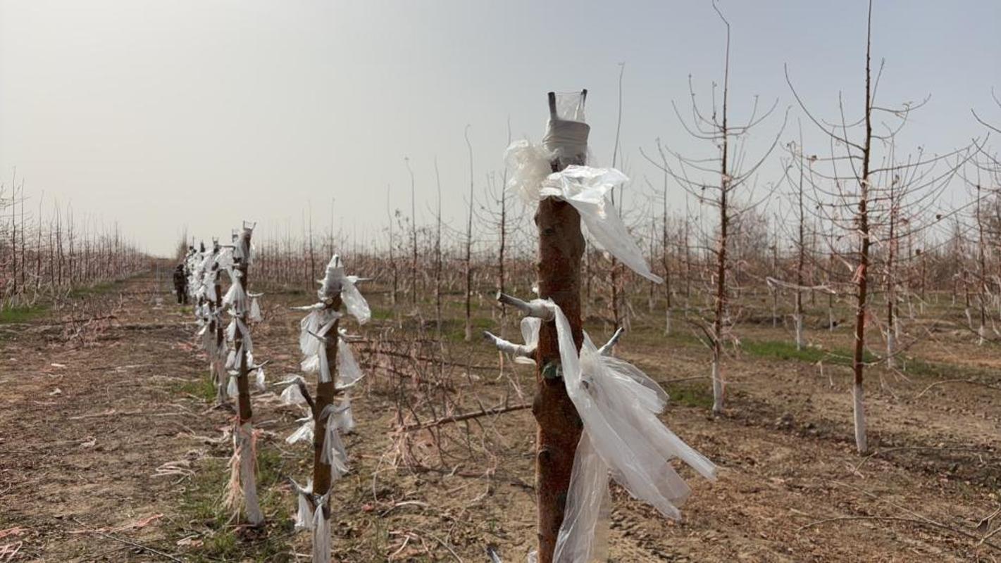 团队在当地高标准果园完成团队自主培育苹果新品种“疆美”嫁接作业,与果农携手共建“疆美”苹果高标准示范园,为优质新品种规模化推广、标准化种植打下坚实基础。
